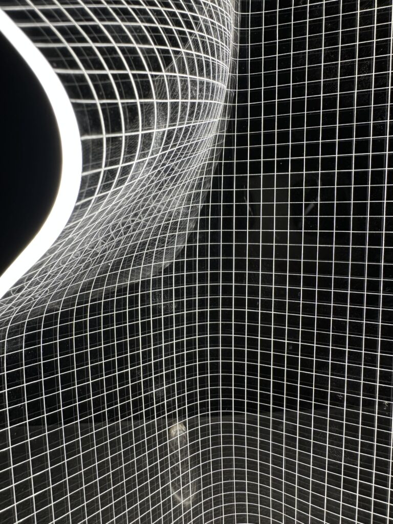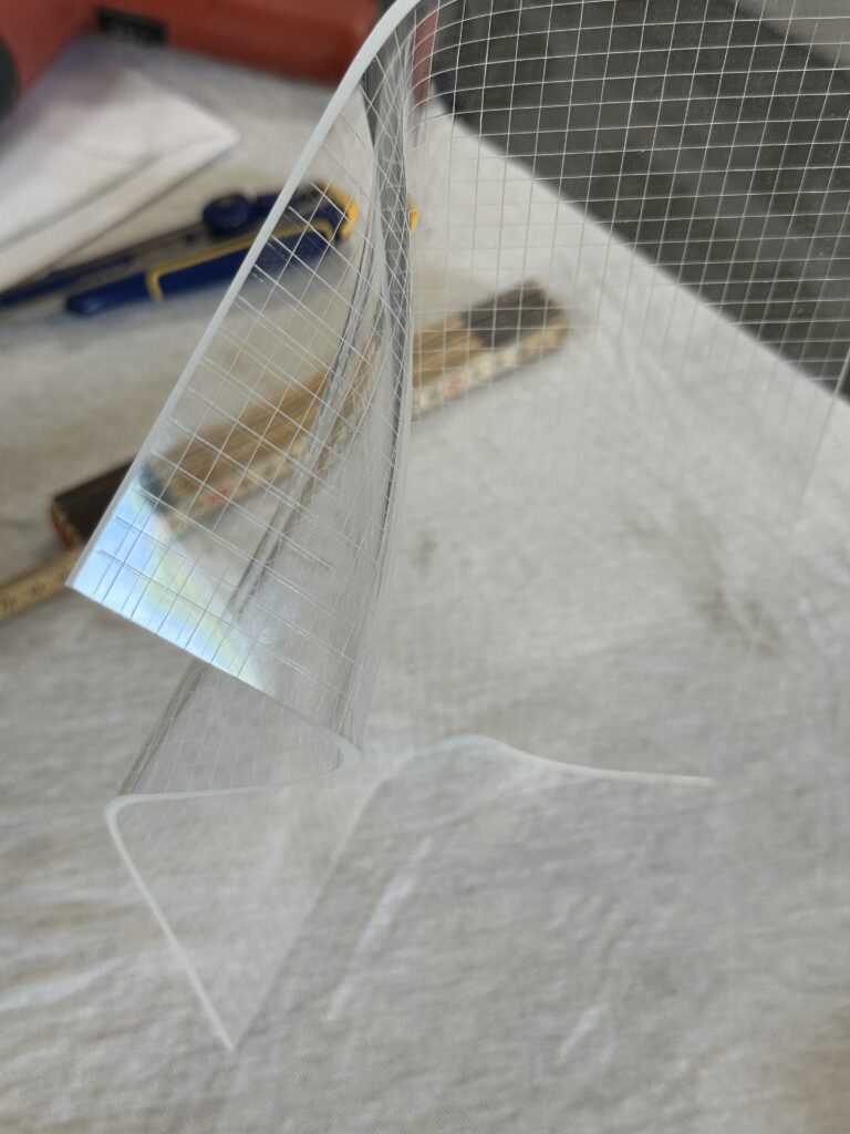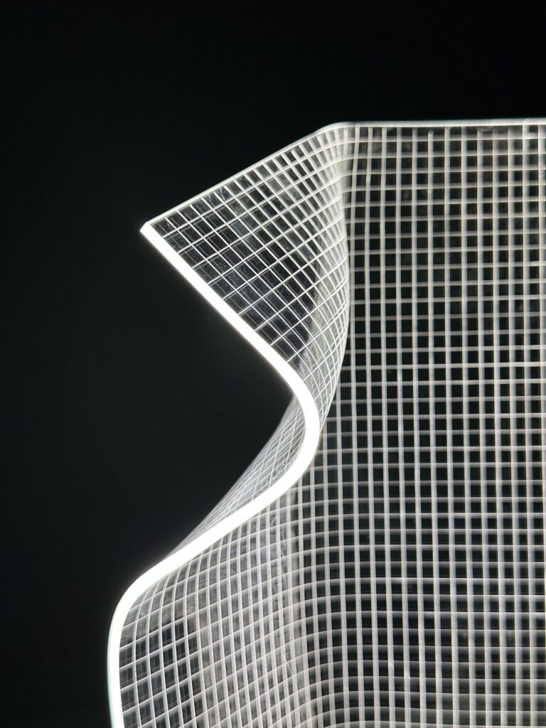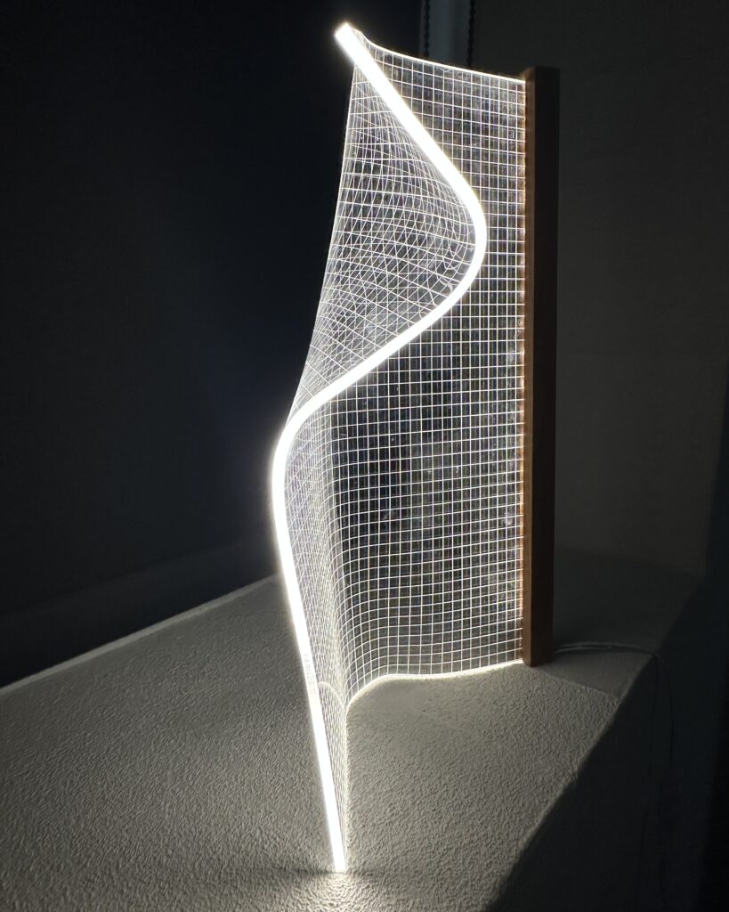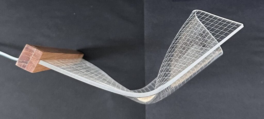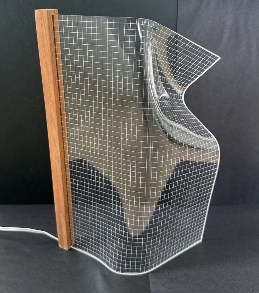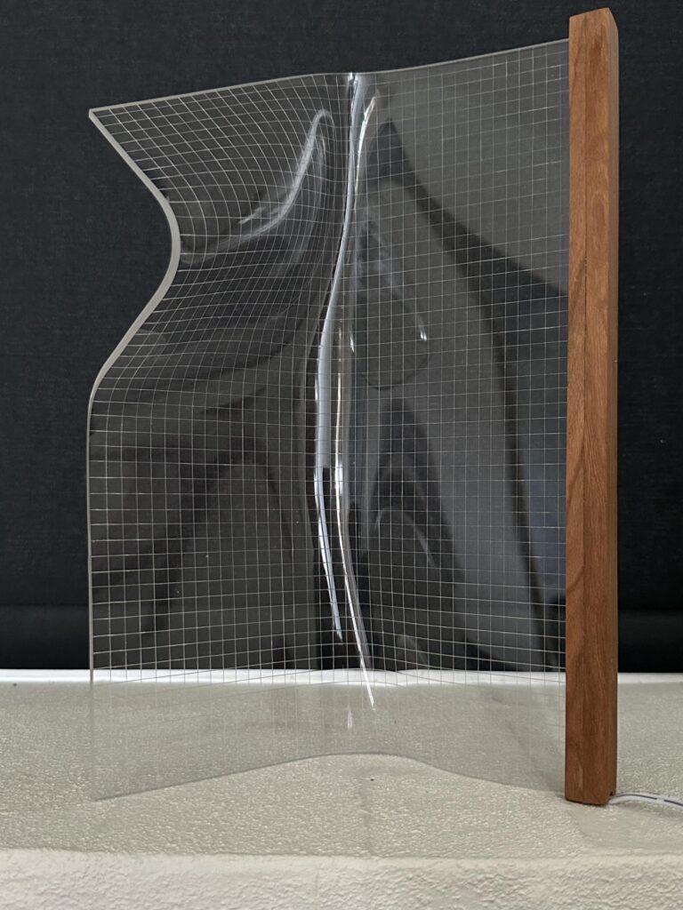 Lampen er lavet af en plade i akryl, der bliver varmet op og bukket i facon. Derfor er der ikke to lamper der fremstår ens. Lyskilden sidder i trælisten lavet i teak og spreder sig i de ridsede firkanter i plexiglasset.